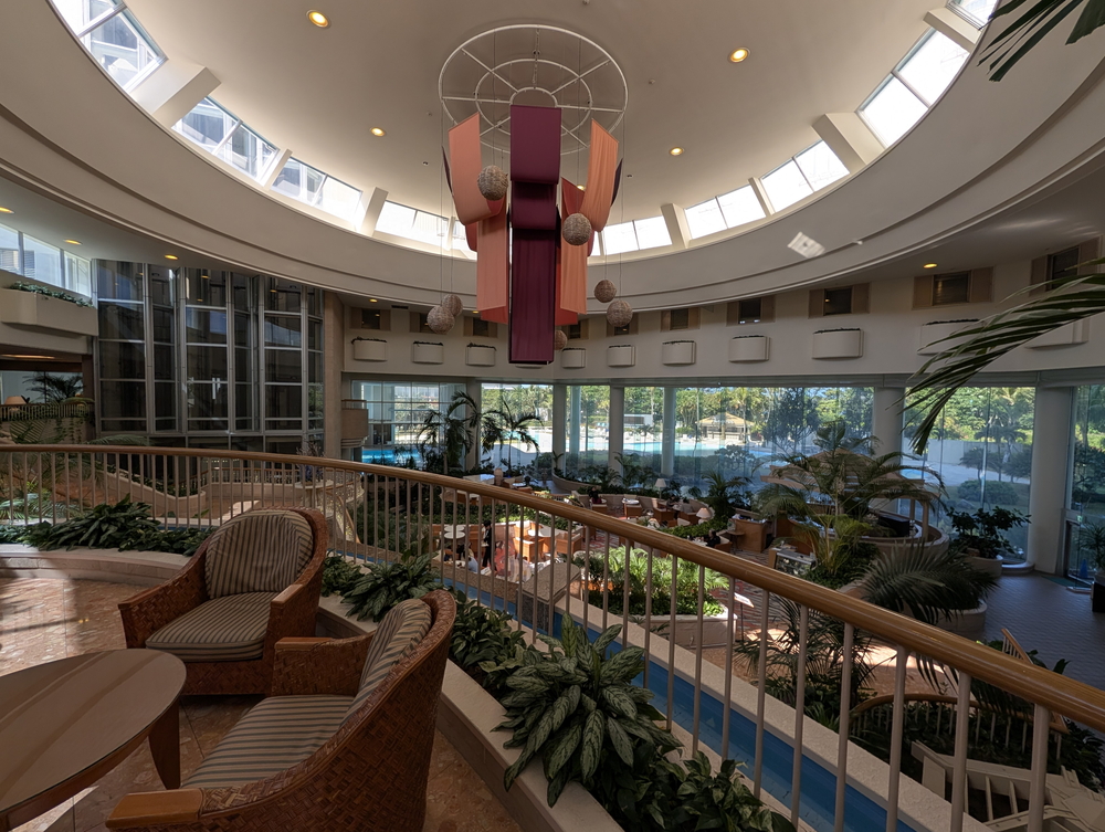 開放感のある熱帯植生のロビーへ、滝が落ち、川がチョロチョロ流れるという、今や失われたリゾートホテル趣味がてんこ盛り!