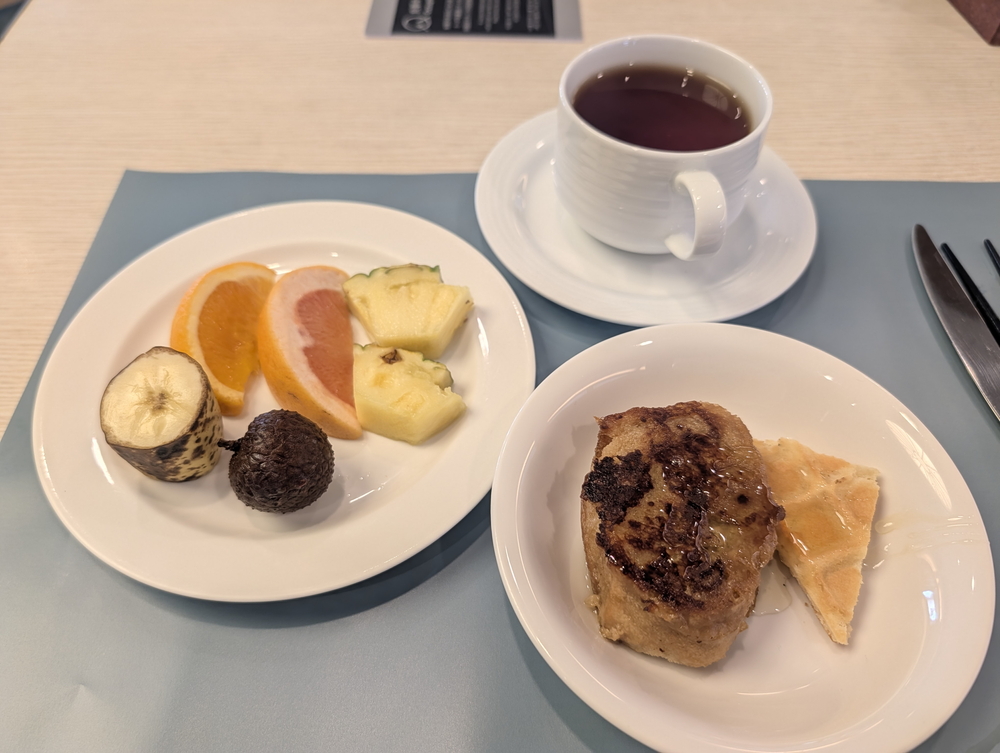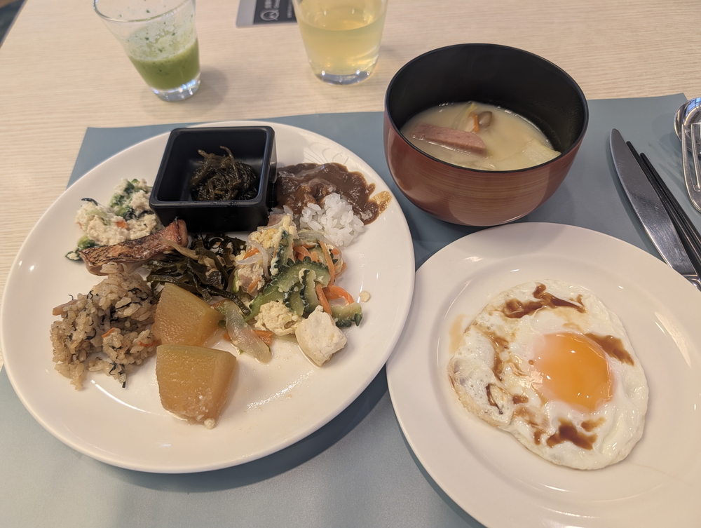 もちろん、那覇のハイクラスほど気張った内容ではなく、まぁまぁなシティホテルの標準て感じ。業務品の菓子パンの種類が1つ2つ多めだったり、ほんのちょっとした加算の積み重ねでもって、「ま、ええか」という感想につなげています。