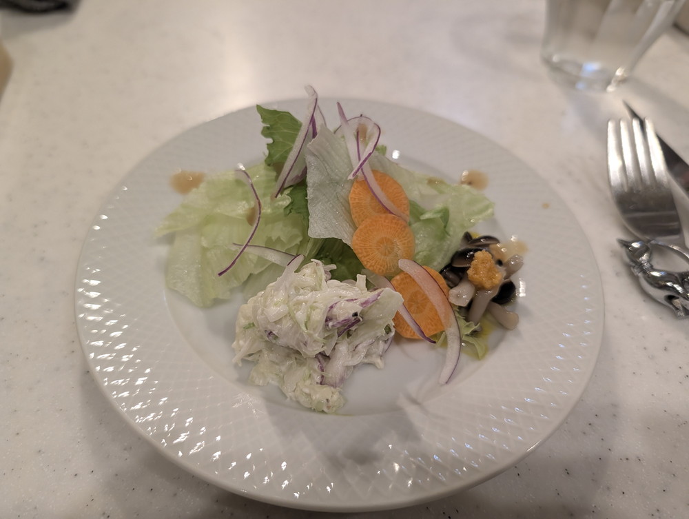 その分、ちょっとしたサラダが出るようになり、やはり単なる葉っぱだけでやっつけないところに好感です。