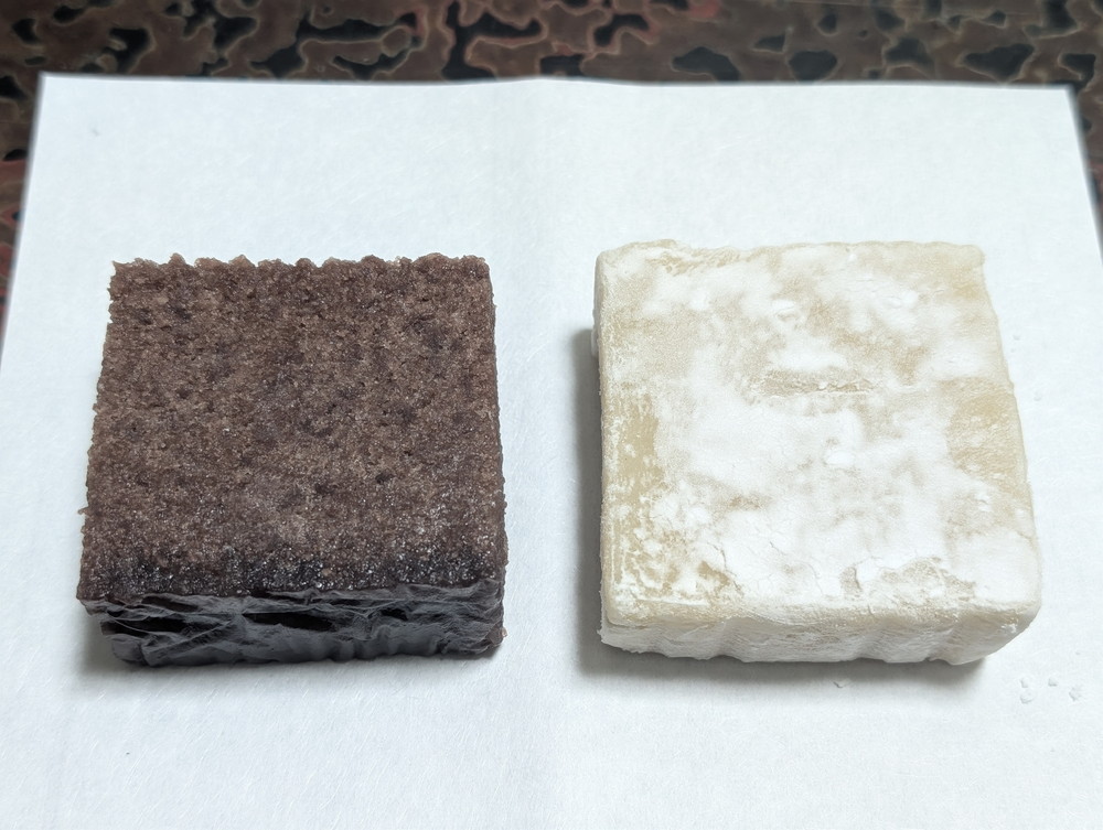 軽羹は意外と繊細で真面目なお菓子で、20℃以上で保存しない食感を損ねてしまうらしく、我が家のように、ろくに断熱されてないクソ寒部屋に置いてしまった場合は、現地倣って焼いてみるのも面白いですよ。