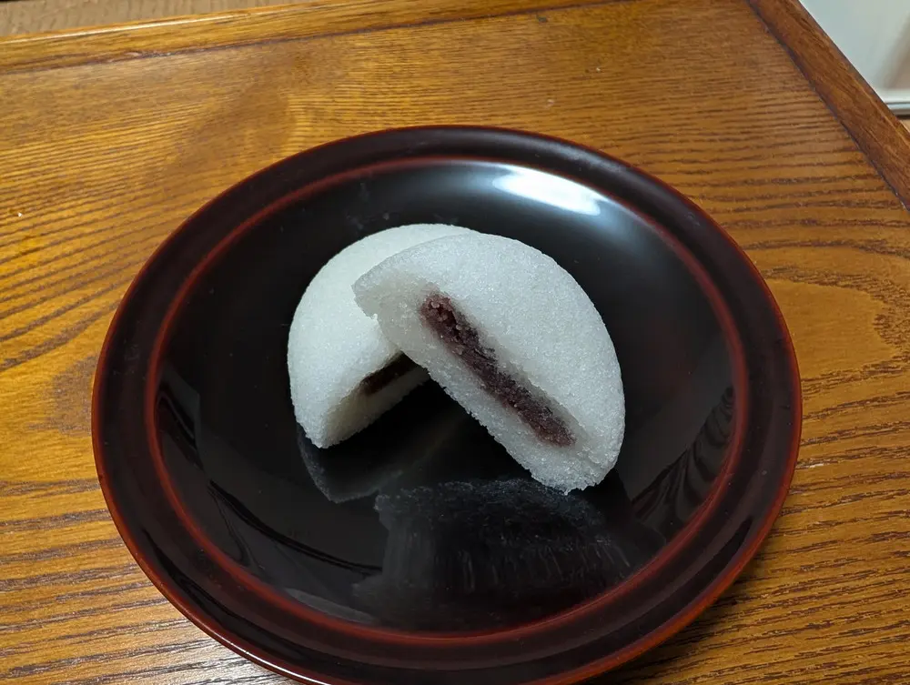 大黒餅は、弾力ある黒糖求肥でうっすら粒あんこを巻いたもの。いかにも黒糖スイーツな風味。