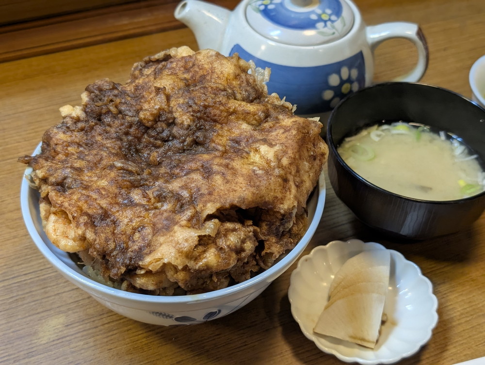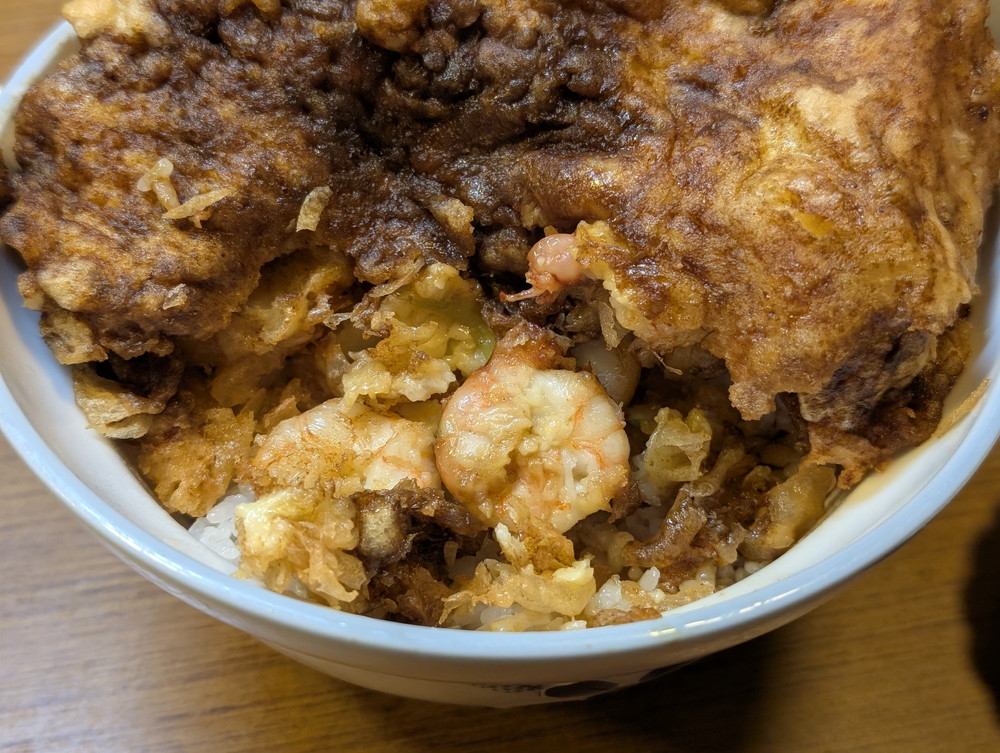 例によって、ご飯は少なくしてもらってるんだけど、それでも丼の縁からはみ出てくるかき揚げの巨塊は、まさに別製を掲げるに相応しき異風です。