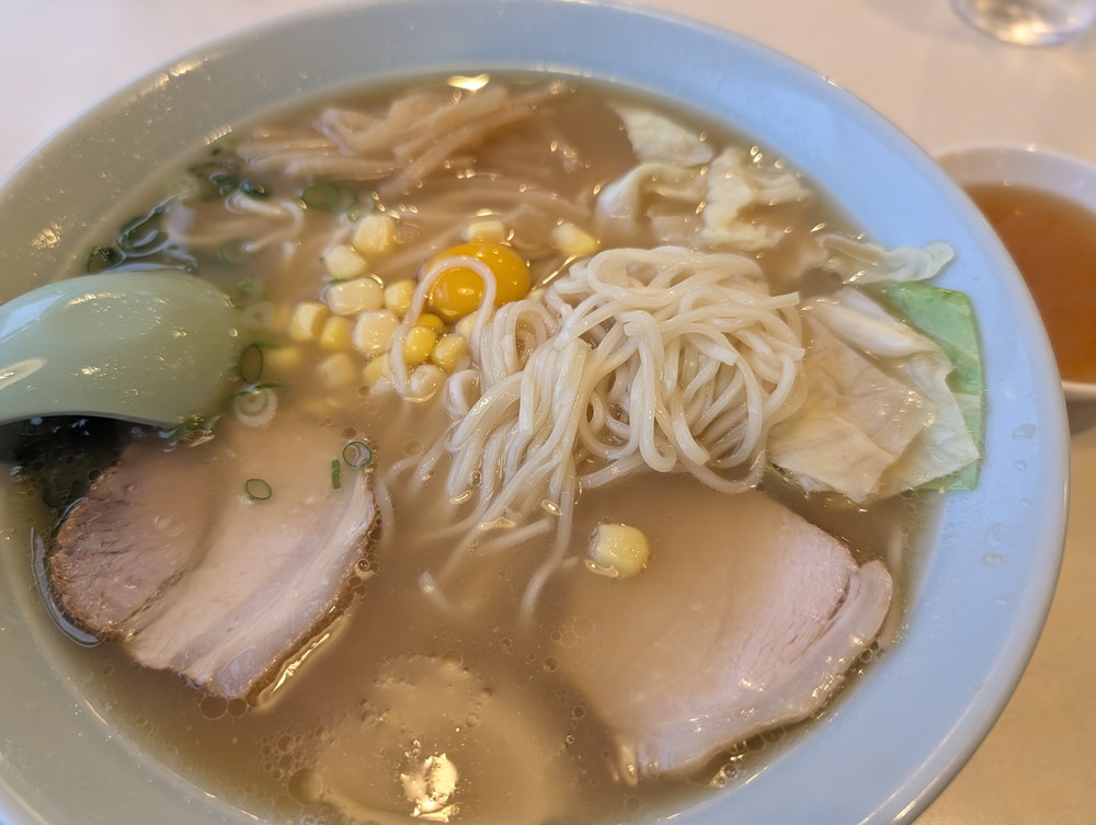 コーンが田舎っぽいけど、食べごたえのある豚に、独特の中華風味を漂わせる細メン、キャベツ、ネギ。