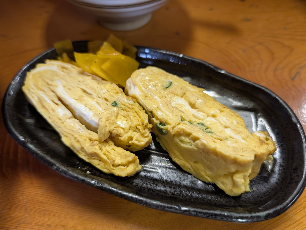 ちんまりネギの入った分厚い玉子焼は、甘くしない関西風のだし巻で、レンチンしてほんわか温めてくれます。