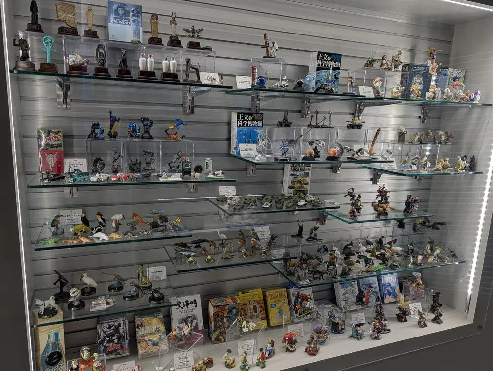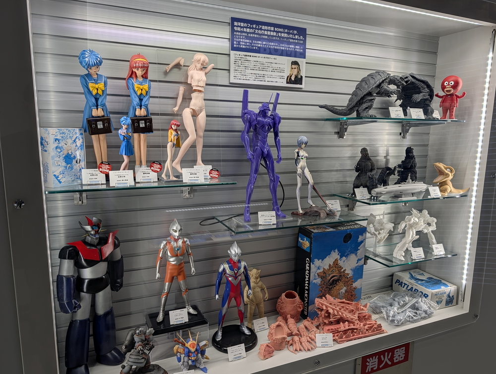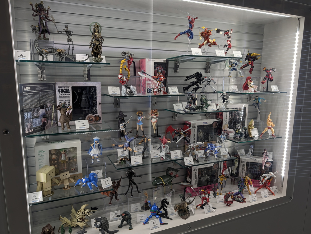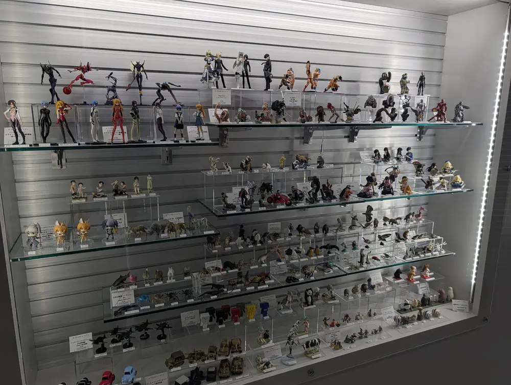 門真のホビーランドの規模には及びませんが、壁面には商品やコレクションの展示もあって、飽きませんね。