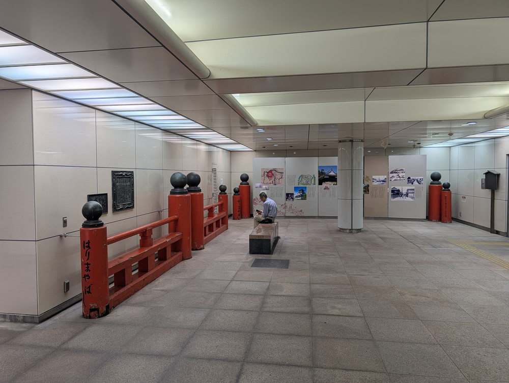 地下道には昭和から平成まで使われていた朱塗りの欄干と、現地では歴代4つのはりまや橋を拝むことが出来るのですが、