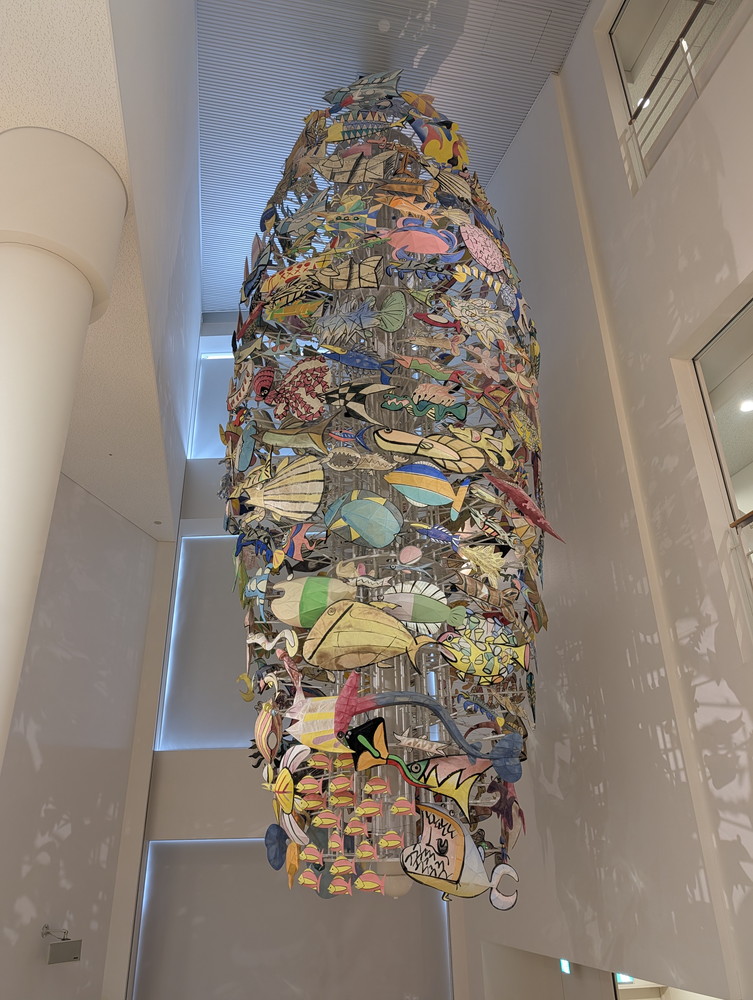 ぐるぐる回る魚群のモニュメントも迫力あり。