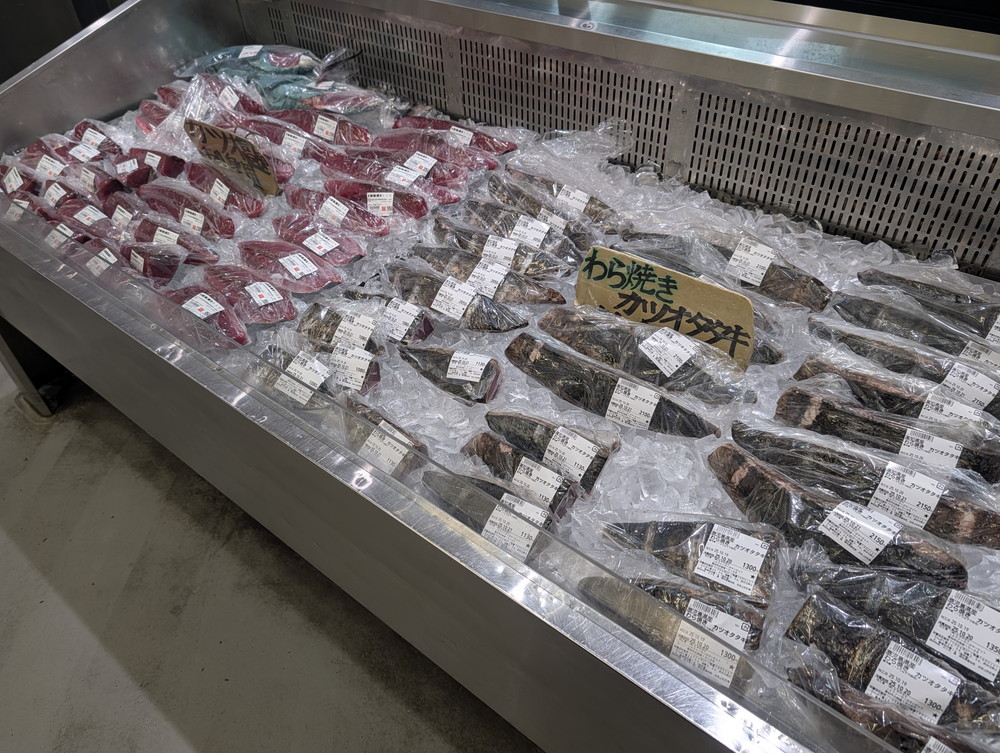 丸ごと一匹姿のままのカツオが並んでて