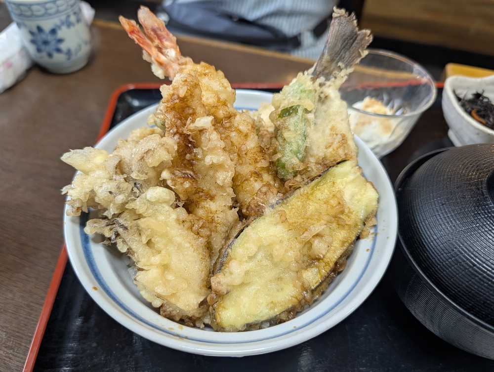 エビや野菜の他、アジやコチがふっくら揚がっていて、これは海辺の天丼ぽいわ。