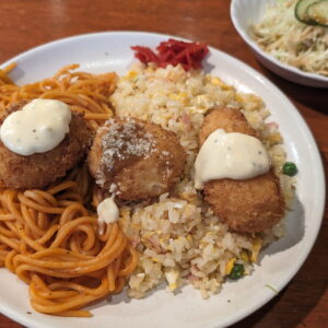 地元のお客さんは、やはり独特なカレーを目当てにやってくるようでしたが、長崎らしくトルコライスも提供され、ピラフへカレーを掛けてくれる無料サービスがあります。