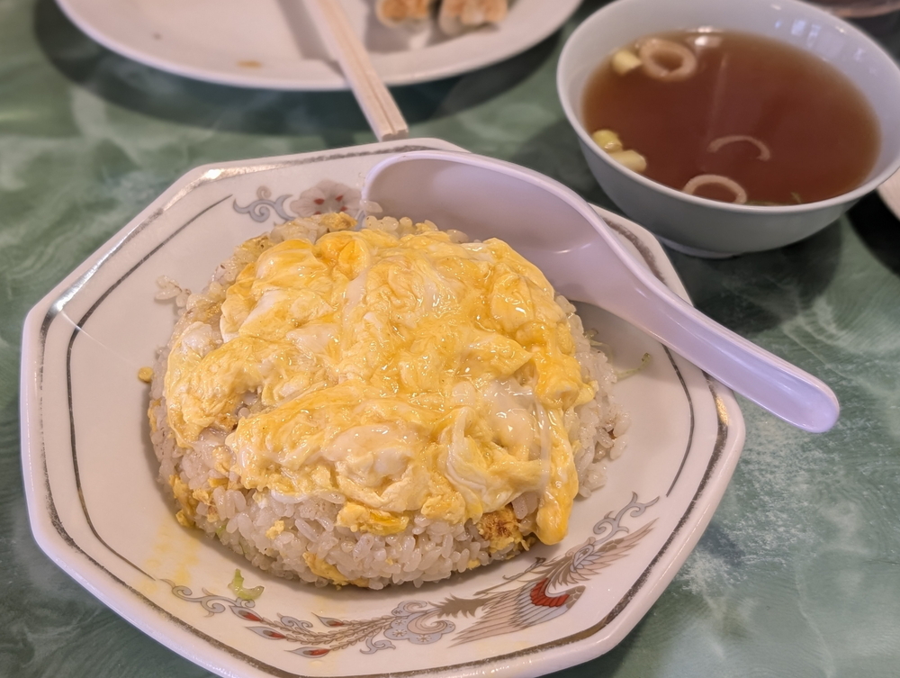 ベースのチャーハンは、玉子とネギのシンプルなもの。やや、しっとりして、ヤキメシのような風合いでもありますね。そこへトロトロな玉子焼がかぶさって、もう・・・