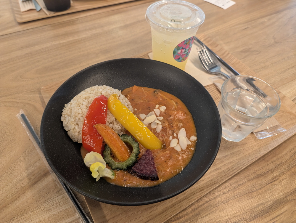 県産野菜をとりどりに使用したもので、玄米ライスは片隅にほんのちょこっとだったようです。ヘルシー。