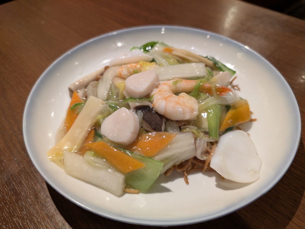 彩り良き塩餡ベースで、立派なエビやイカ、ホタテが乗ってくるルックス豪勢な品。