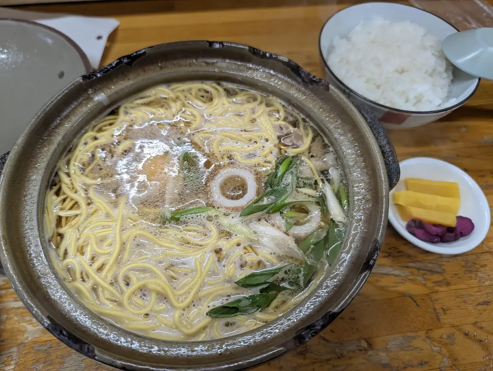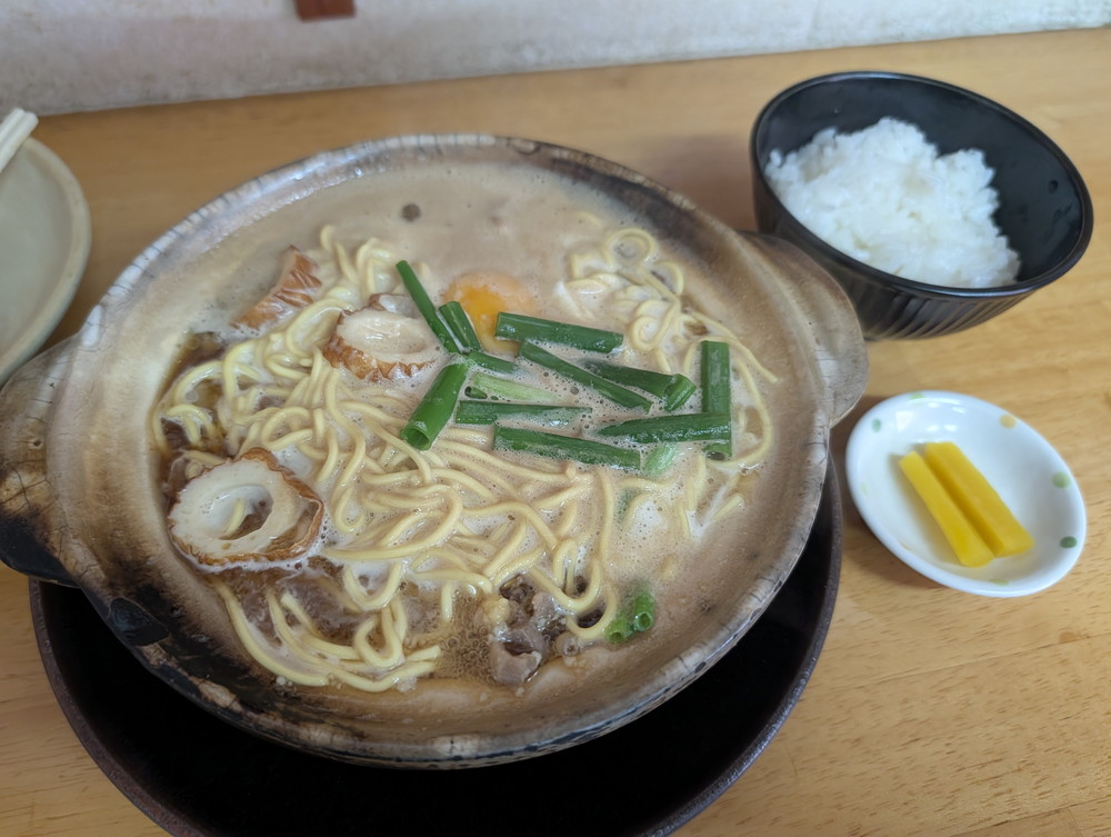 今回の旅で、いくつかの鍋焼きラーメンをいただきましたが、こちらは段違い。